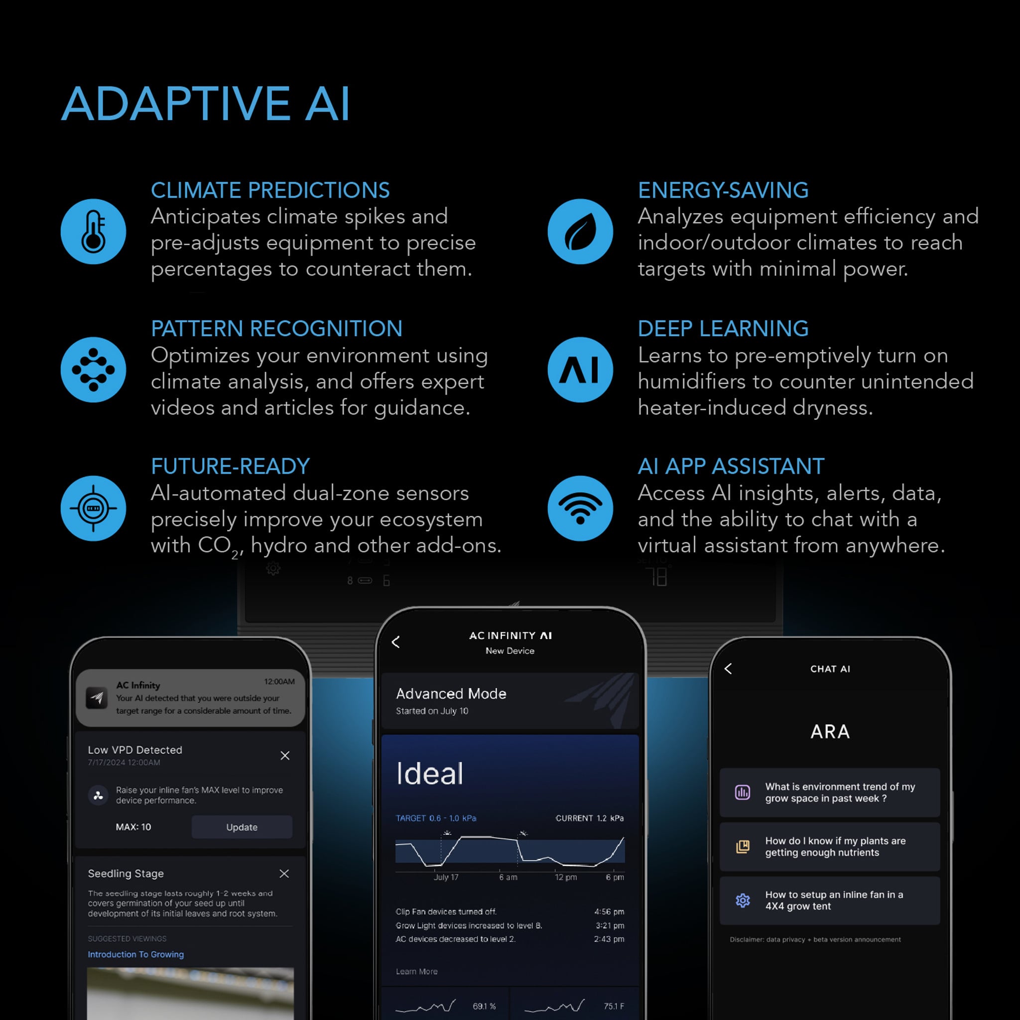 CONTROLLER AI+ overvåker temperatur, luftfuktighet og luftstrøm kontinuerlig. Ved hjelp av sanntidsdata og historiske målinger justeres tilkoblede komponenter automatisk for å sikre stabile og optimale vekstforhold gjennom hele dyrkesyklusen.