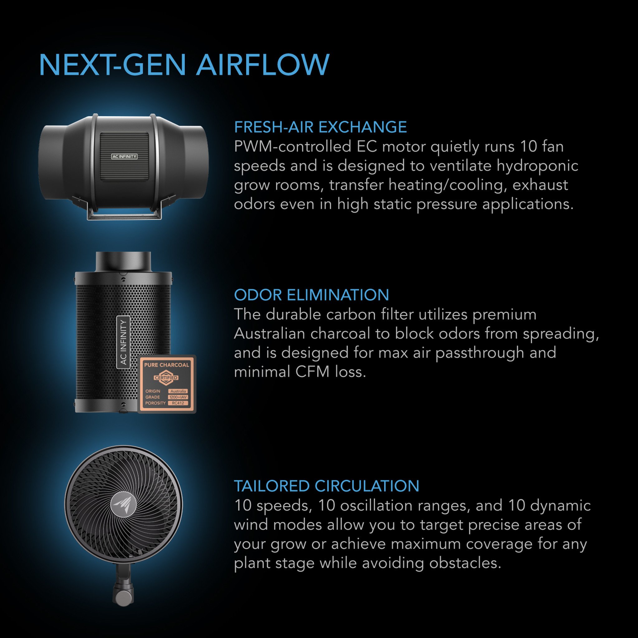 Systemet inkluderer en energieffektiv EC-inlinevifte med 100 mm kanaltilkobling, kullfilter og fleksibel ventilasjonsslange. Dette sikrer effektiv fjerning av overskuddsvarme, fukt og lukt. En oscillerende sirkulasjonsvifte bidrar til jevn luftbevegelse rundt plantene.