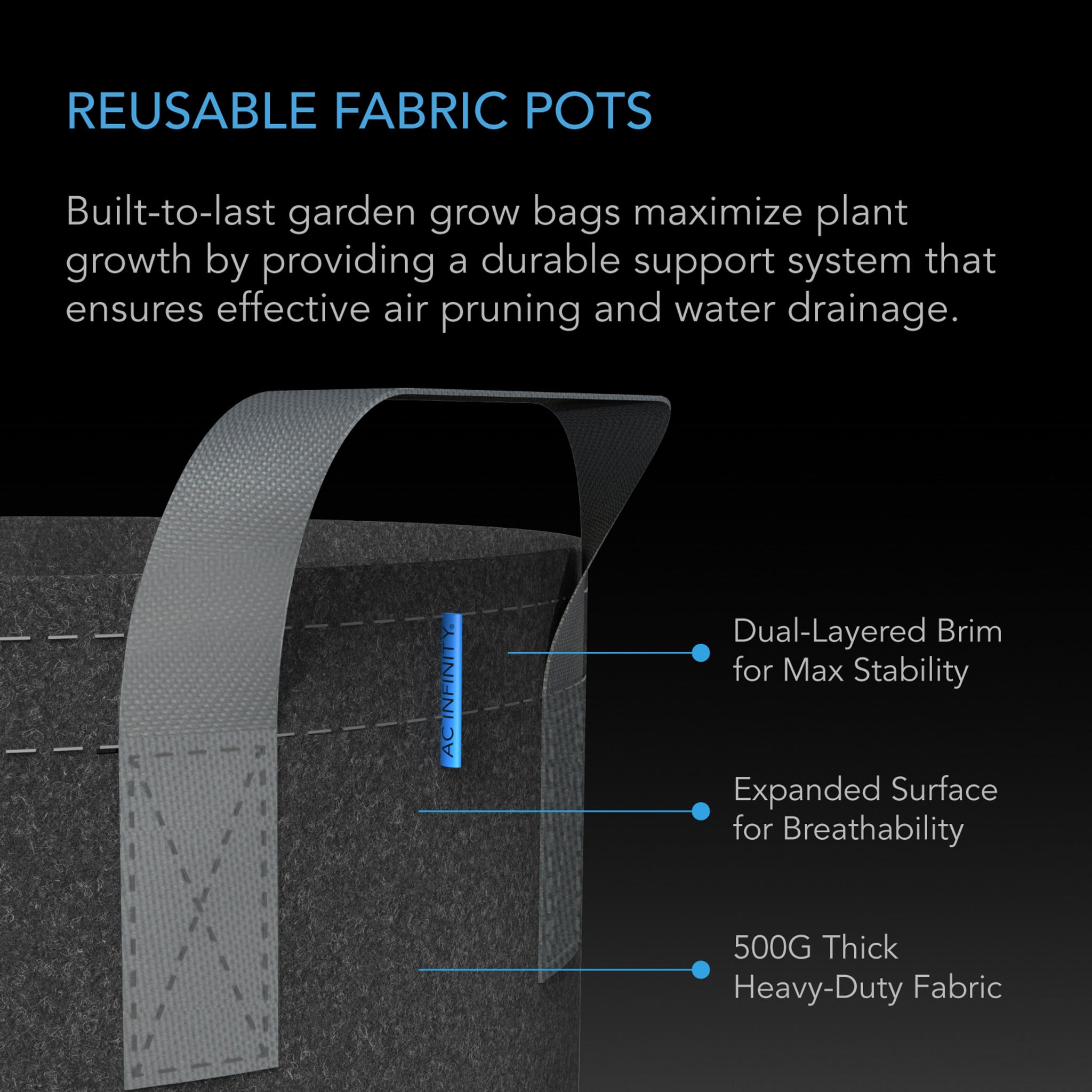 De medfølgende tekstilpottene har et volum på ca. 19 liter per potte og er utviklet for å lede bort overskuddsvann mer effektivt enn tradisjonelle plastpotter. Materialet bidrar også til luftbeskjæring av røttene, noe som kan støtte en tettere og mer balansert rotstruktur.