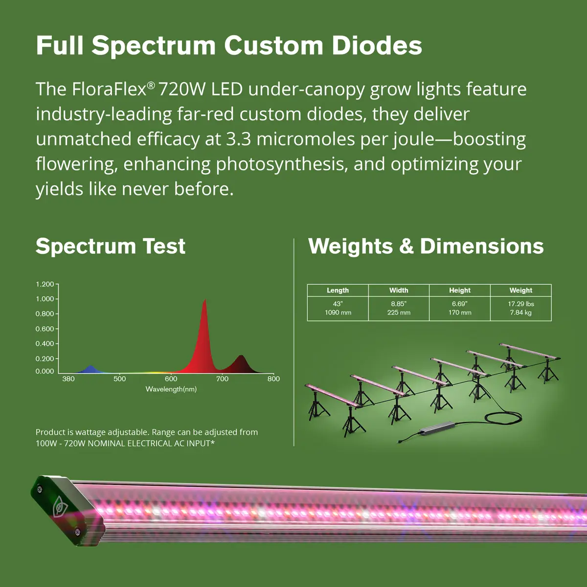 Dette 720W Far-Red LED-vekstlyset er spesialdesignet for under-canopy-bruk og gir enestående lyseffektivitet på 3,3 µmol/J og totalt PPF på 2376 µmol/s. Utstyrt med tilpassede fullspektrumdioder og Osram Far-Red, er det ideelt som supplementalys for å stimulere blomstring og produksjon i de nedre planteområdene.