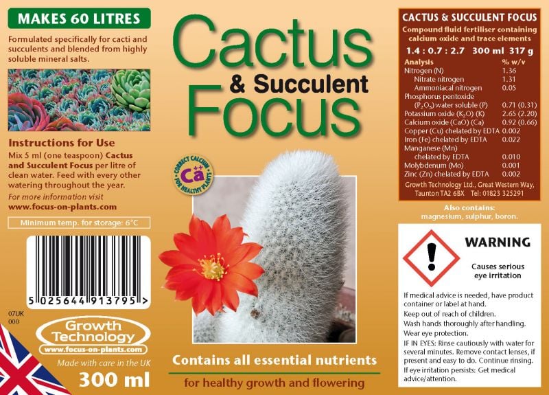 Cactus & Succulent Focus er en balansert næringsløsning for kaktus og sukkulenter. Inneholder essensielle næringsstoffer samt humus- og fulvinsyre for sunn vekst og sterk rotutvikling.