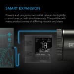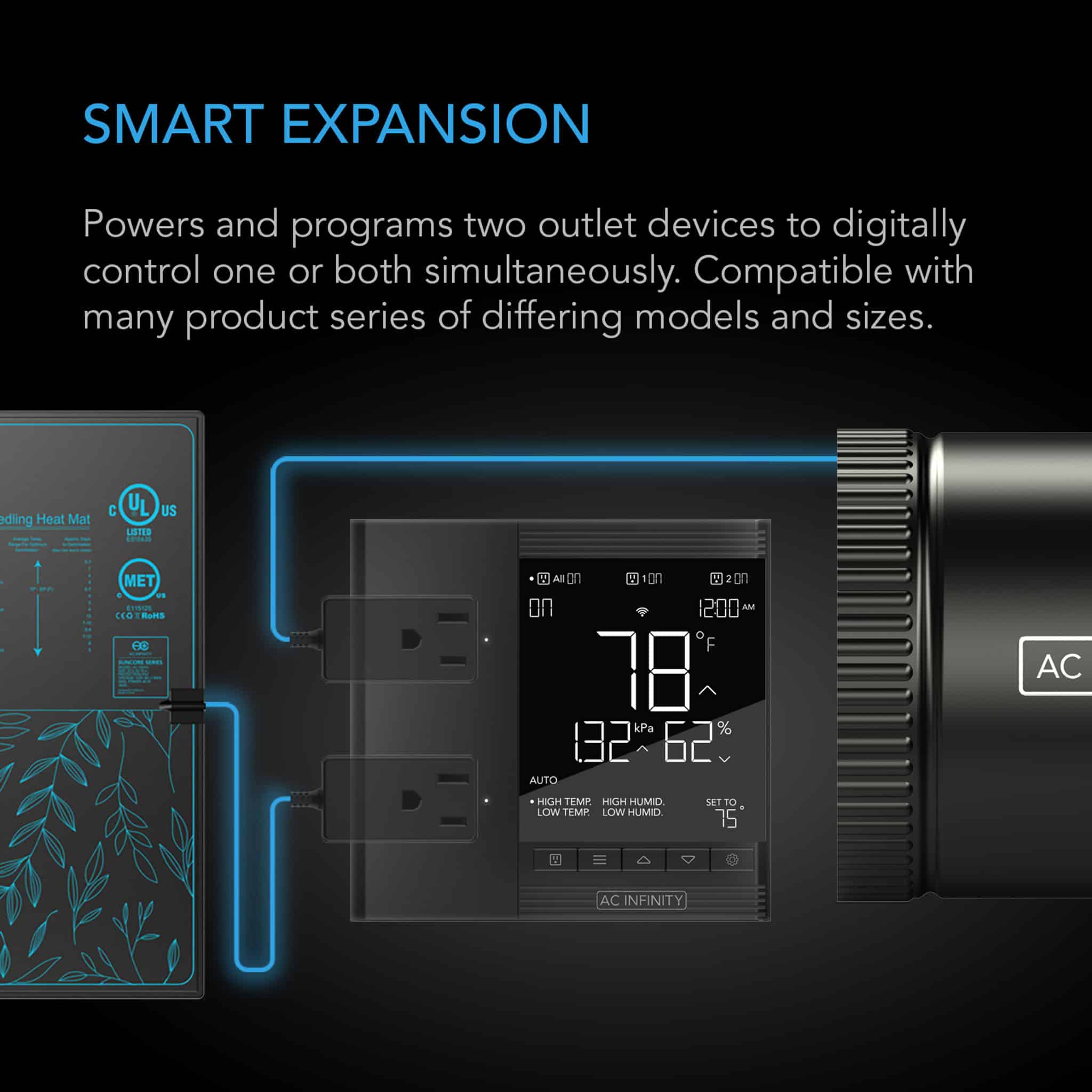 Kontrolleren har en bakgrunnsbelyst LCD-skjerm som viser gjeldende klima, samt en 3,6 meter lang sensor med vanntett sensorhode for nøyaktig måling av temperatur, fuktighet og VPD. Hvert uttak kan programmeres med egne triggere basert på temperatur, fuktighet, VPD, tidsstyrte sykluser eller faste klokkeslett. Bufferinnstillinger lar deg tilpasse følsomheten for klimaendringer.