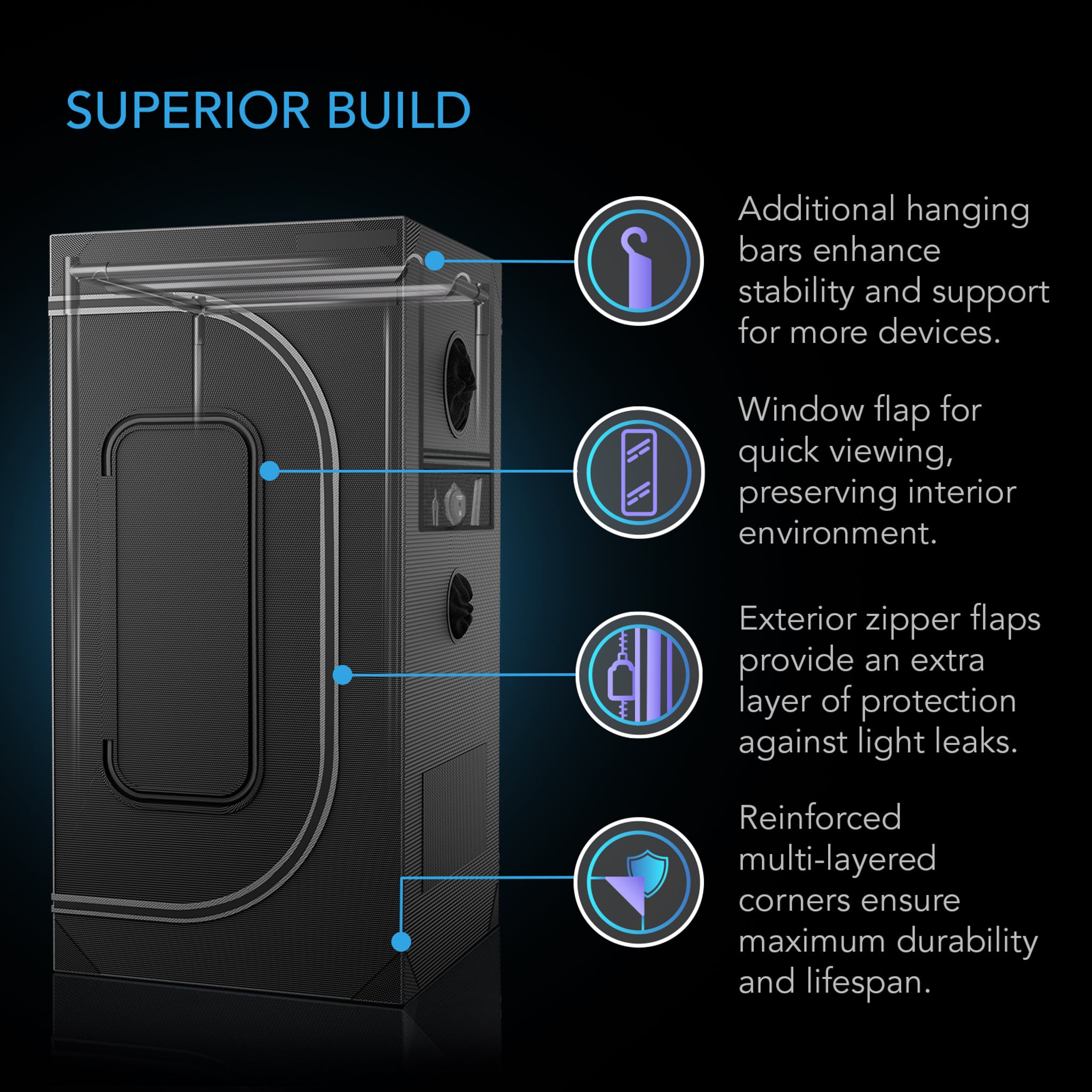 Dyrketeltet er produsert i slitesterkt Oxford-stoff og bygget rundt en solid stålramme. Innsiden er kledd med reflekterende Mylar som maksimerer lysutnyttelsen. Forbedret lystetting og større inspeksjonsvinduer gir god oversikt uten å påvirke klimaet.