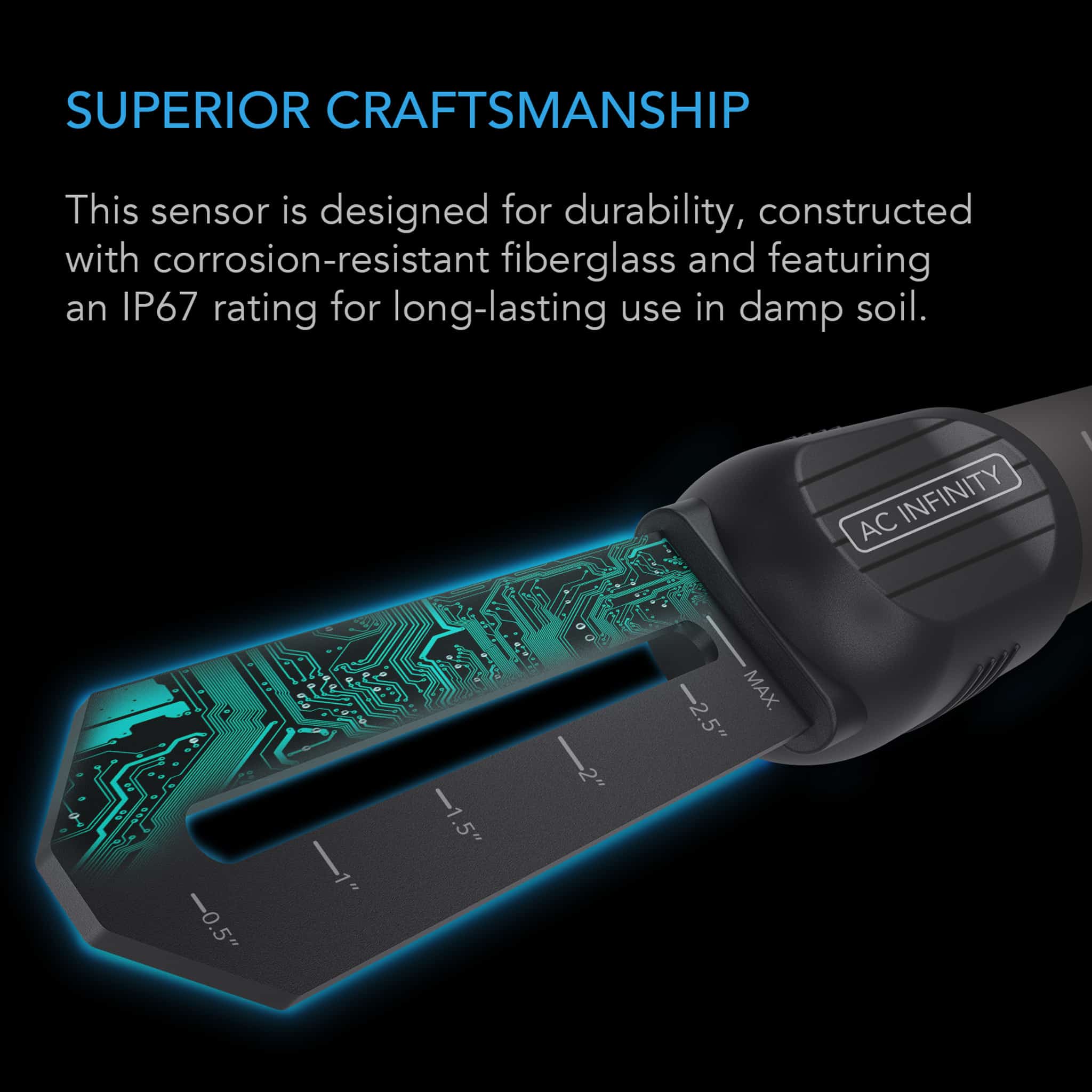 Vanntett jordfuktighetssensor (IP67) for AC Infinity Controller AI+, som overvåker jordens metningsnivå og muliggjør smart, automatisk vanningskontroll i vekstrom og hage.